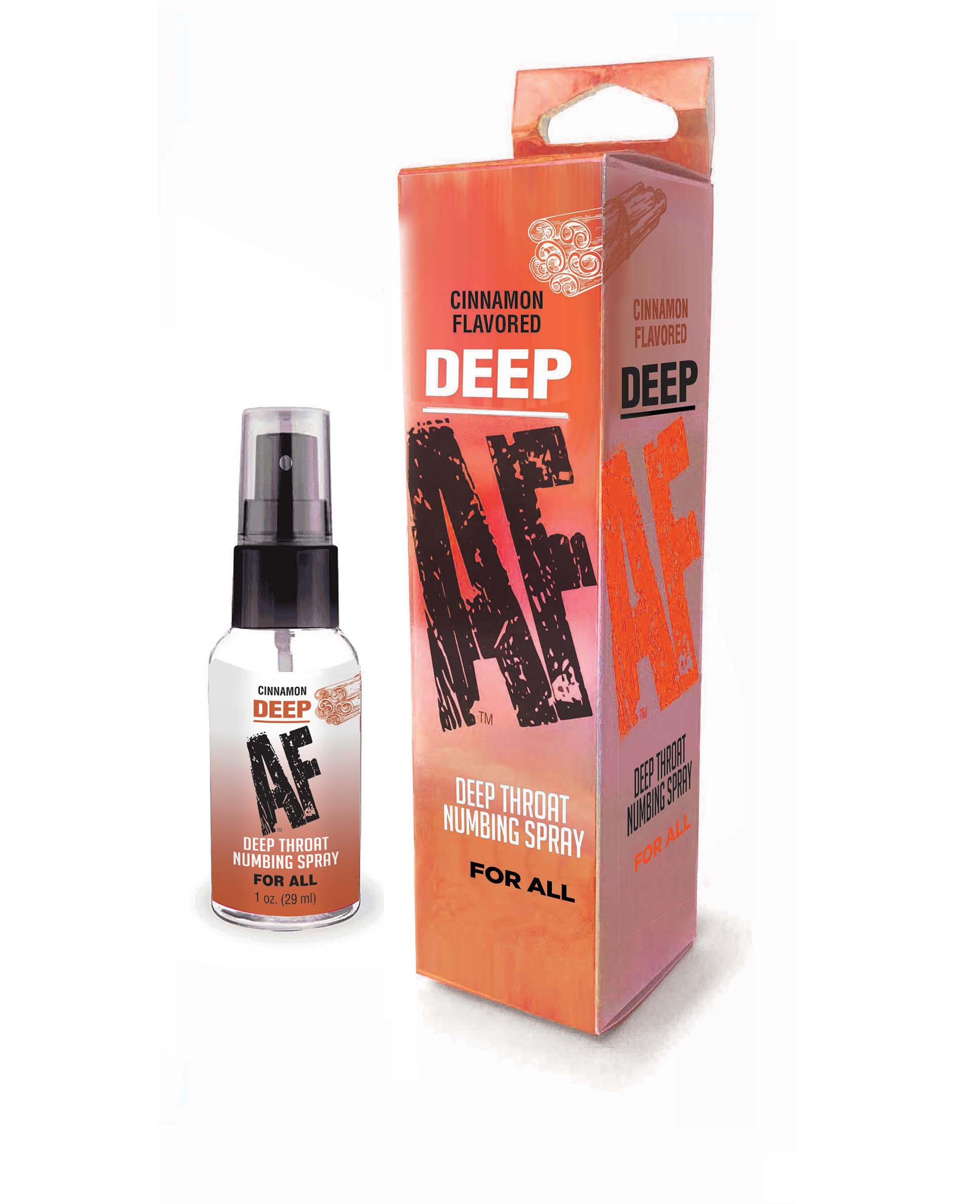 Deep AF Cinnamon 29.5ml Deep Throat Spray: Find out just how deep you can go without that annoying gag reflex getting in the way! Deep AF Throat Spray is an oral desensitizer designed to reduce your gag reflex and any discomfort you might experience while performing oral sex. The fast-acting spray uses a fine mist infused with Benzocaine to gently numb the sensitive, hard-to-reach nerves in the back of your mouth and upper throat. Try Deep AF in cinnamon, mint, cherry, peach, strawberry, watermelon, and our newest flavor, cupcake. Deep AF Throat Spray comes in a 29.5ml, 1 oz. bottle. The numbing spray is made in the United States and contains no parabens or sugar. For use: Insert the applicator in your mouth with the tip pointing toward your throat. Spray 2-3 times, approximately 2-5 minutes before performing oral sex.