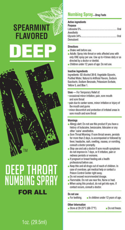 Deep AF Spearmint 29.5ml Deep Throat Spray: Find out just how deep you can go without that annoying gag reflex getting in the way! Deep AF Throat Spray is an oral desensitizer designed to reduce your gag reflex and any discomfort you might experience while performing oral sex. The fast-acting spray uses a fine mist infused with Benzocaine to gently numb the sensitive, hard-to-reach nerves in the back of your mouth and upper throat. Try Deep AF in cinnamon, mint, cherry, peach, strawberry, watermelon, and our newest flavor, cupcake. Deep AF Throat Spray comes in a 29.5ml, 1 oz. bottle. The numbing spray is made in the United States and contains no parabens or sugar. For use: Insert the applicator in your mouth with the tip pointing toward your throat. Spray 2-3 times, approximately 2-5 minutes before performing oral sex.