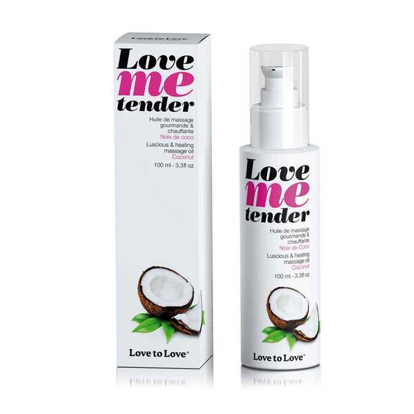 Love Me Tender Massage Oil Coconut: WARMING MASSAGE OIL Want your skin tingle with excitement? Sweet taste lovers will enjoy this gorgeous coconut flavored oil. This luscious and heating massage oil sublimates your caresses and offers you sensitive pleasure. Apply the dose given by to the part of the body that you want to care and heat. Blow to rouse desire and excite the senses of your partner. Massage, kiss and lick and kiss however you want to and enjoy torrid body-to-body that smell divine with Love me tender! INFORMATION: For external use onlyIn case of contact with eyes, rinse with water.In case of allergic reaction, stop the use.Keep away from light and heat.Capacity – 100ml / 3.3 fl oz IGREDIENTS : Glycerin, Propylene Glycol, Aroma, Sodium Saccharin
