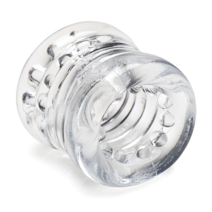 Master Series Ball Stack Ball Stretcher Clear: Enhance your pleasure and extend the duration of your play when stretching your balls! This stacked ball stretcher is made out of body-safe, phthalate-free, stretchy TPE and fits over the balls and firmly holds them away from your shaft. The stacked layers give you just enough stretch and pull without any forcefulness or pain. They have a good amount of give to them so they’ll remain comfortable while being worn for a long duration and moving around from position to position. At both ends of the tunnel are rows of textured nubs that add extra stimulation and grip. Use only with water-based lubricants for best results and avoid petroleum products. To clean, use warm water and mild soap, then rinse it off and spray it with a toy cleaner before letting it air dry.Use some lube on your shaft and balls, then rub lube on the inside of the tunnel. Gently start to tug down on your balls, relaxing as much as you can. Stretch it open and pop one ball in at a time. Once it is on, tug gently and make sure enough lube is used so the skin isn’t being pulled. Start to stroke yourself. Feel how your hard shaft pulses now that the balls are tugged down, keeping you from blowing your load too soon but enhancing the feeling and sensation! Let your partner stroke you, suck you, or ride you until you finally blow! Features: Pleasure Enhancing: Stretch your balls away from your shaft to enhance duration and pleasure! Soft and Stretchy: Enjoy the soft, stretchy material that is easy to stretch and fit over the balls. Textured Nubs: Rows of textured nubs line both ends of the tunnel to add extra stimulation. Body-Safe TPE: Made out of phthalate-free TPE. Measurements: Overall: 1.9 inches x 1.9 inches. Inner diameter (unstretched): 0.94 inches. Materials: TPEColour: Clear