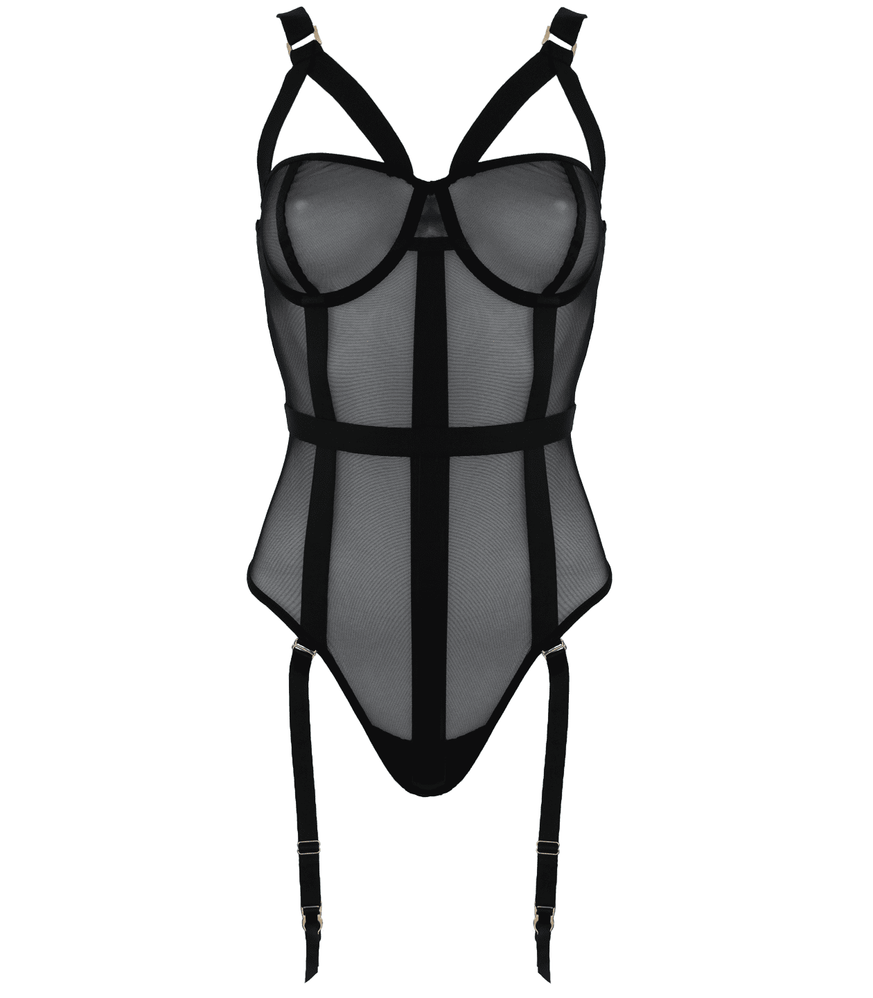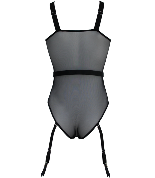 Muse Medium PL009BLK: ย Black mesh one piece teddy features elastic banding that accentuates and flatters the waist and shapes the bust. Silver hardware sits a top a triangle feature on bust and straps hang from the front to style with thigh high stockings for a full look. Soft touch black mesh Black elastic straps with adjustable shoulder sliders Cotton gusset Button crotch Suspender straps