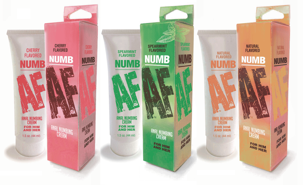 NUMB AF will make your anal experience more pleasurable. Numb AF is a cool mint-flavored anal-numbing cream; the formulation relaxes the muscles and numbs the nerves for greater comfort during anal play. Safe to use with toys as you build up to the anal experience you desire. Apply a dime size gel to the anal opening and wait 3-5 minutes before engaging in anal play. Reapply as needed. Numb AF helps to take the anxiety out of anal play so you can focus on the pleasure of the experience. Please note that Numb AF is not a lubricant and should be used with your preferred personal lubricant. Numb AF has six delicious flavors: Blue Raspberry, Cherry, Cupcake, Mint, Strawberry, andย Unflavored. Each 1.5oz tube comes with a convenient mess-free screw cap.